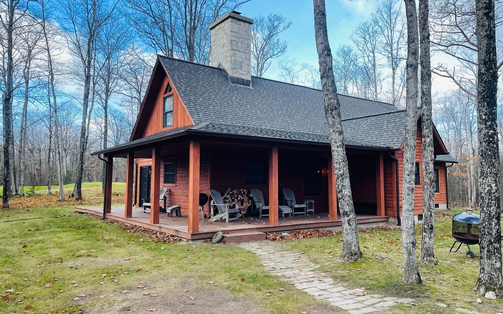 Nestled by an inland pond, Wright Cabin features four bedrooms and four bathrooms with dual porches. The main floor has a cozy living room with a gas fireplace, a fire pit, and a charcoal grill. It can accommodate up to eight guests.
